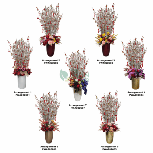 Celebrate Chinese New Year with the Blissful Happiness Deluxe Package with an opulent 9ft tall Pussy Willow centrepiece surrounded by 7 auspicious flowering plants, covering up to 2.5 meters.