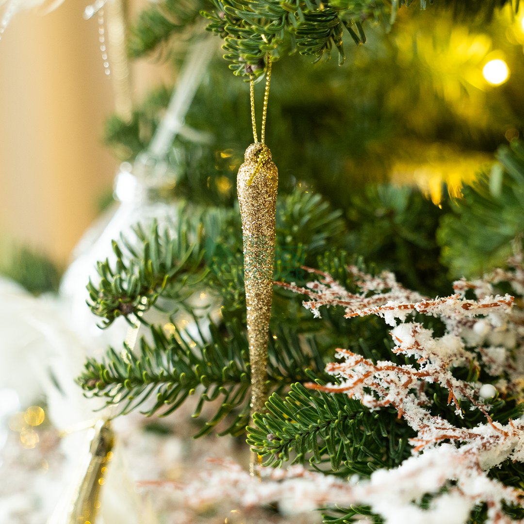 Bring warmth and sparkle to your festive tree with the Glittering Gold Icicle. Designed with a shimmering golden finish that catches the light from every angle, this ornament adds a graceful radiance to your Christmas decor.