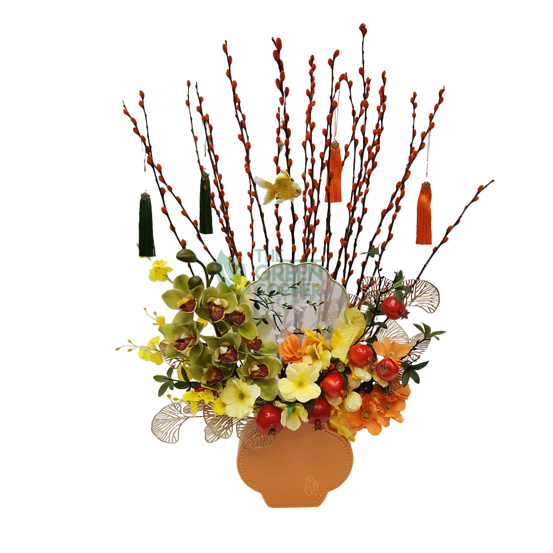 This arrangement is perfect for bringing joyous blessings and timeless beauty into your space with this stunning arrangement, a true embodiment of Chinese New Year celebration.