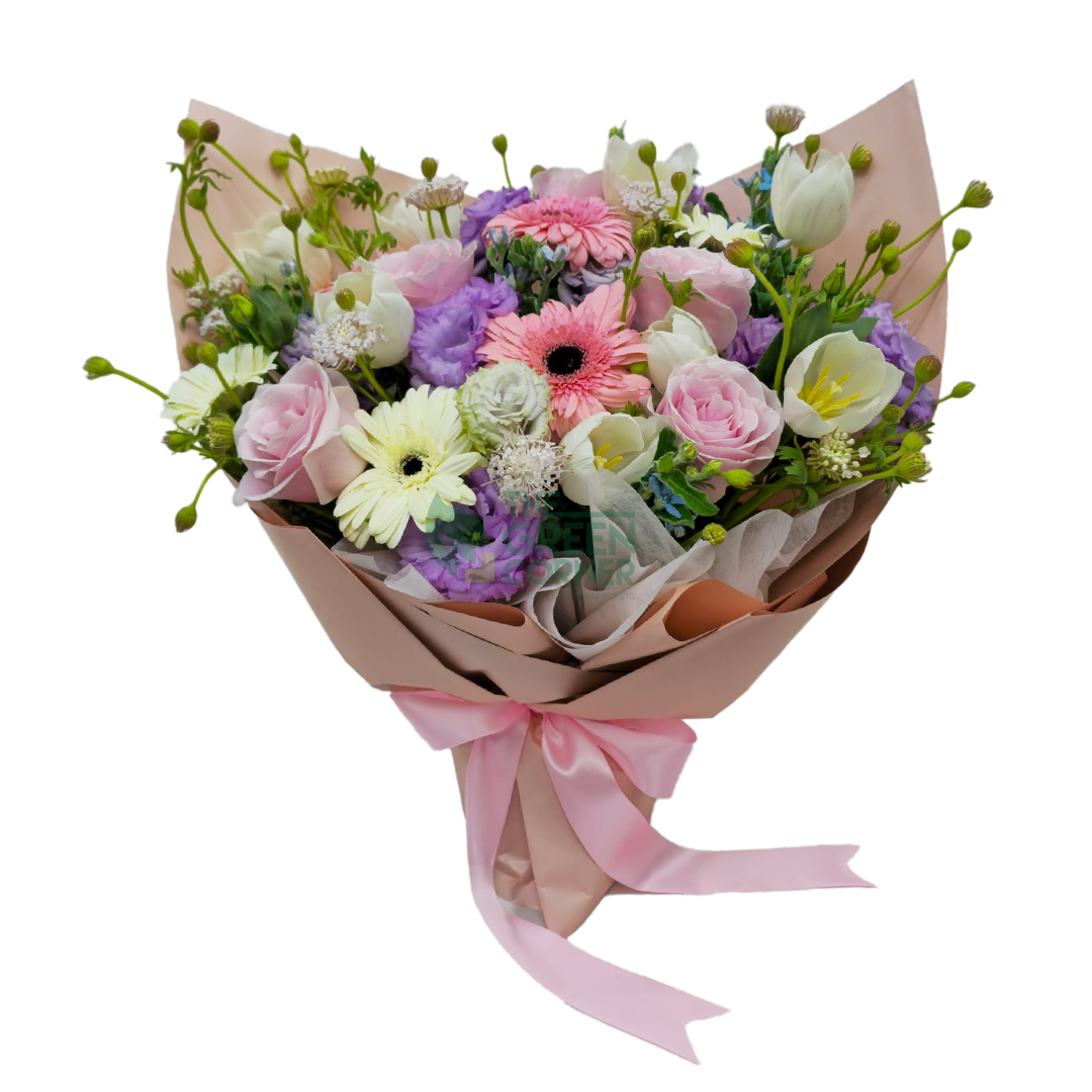 Pink roses symbolise affection and appreciation, while gerberas represent cheerfulness and sincerity. White tulips add elegance and purity, and the airy textures of Eustoma, Didiscus, and Oxypetalum give the arrangement a natural, “wild” yet refined look.